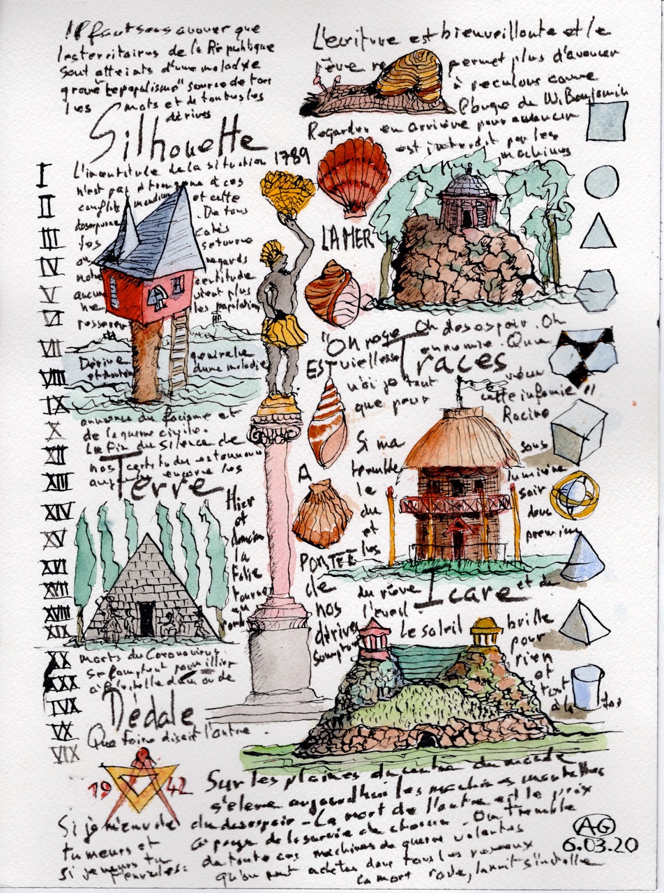 Faced with the numerous pictures raised by these reflections, I tried to take the hand, the drawing hand, and the writing hand to conceive boards without subject, without discourse but open to all possible interpretations in a kind of wandering of the mind. This unfinished set made of writings and automatic drawings realizes a kind of encyclopedia of my wandering imagination (…) The ruins, the primitive hut, the imaginary constructions and the piles of earth often slip into my drawings.