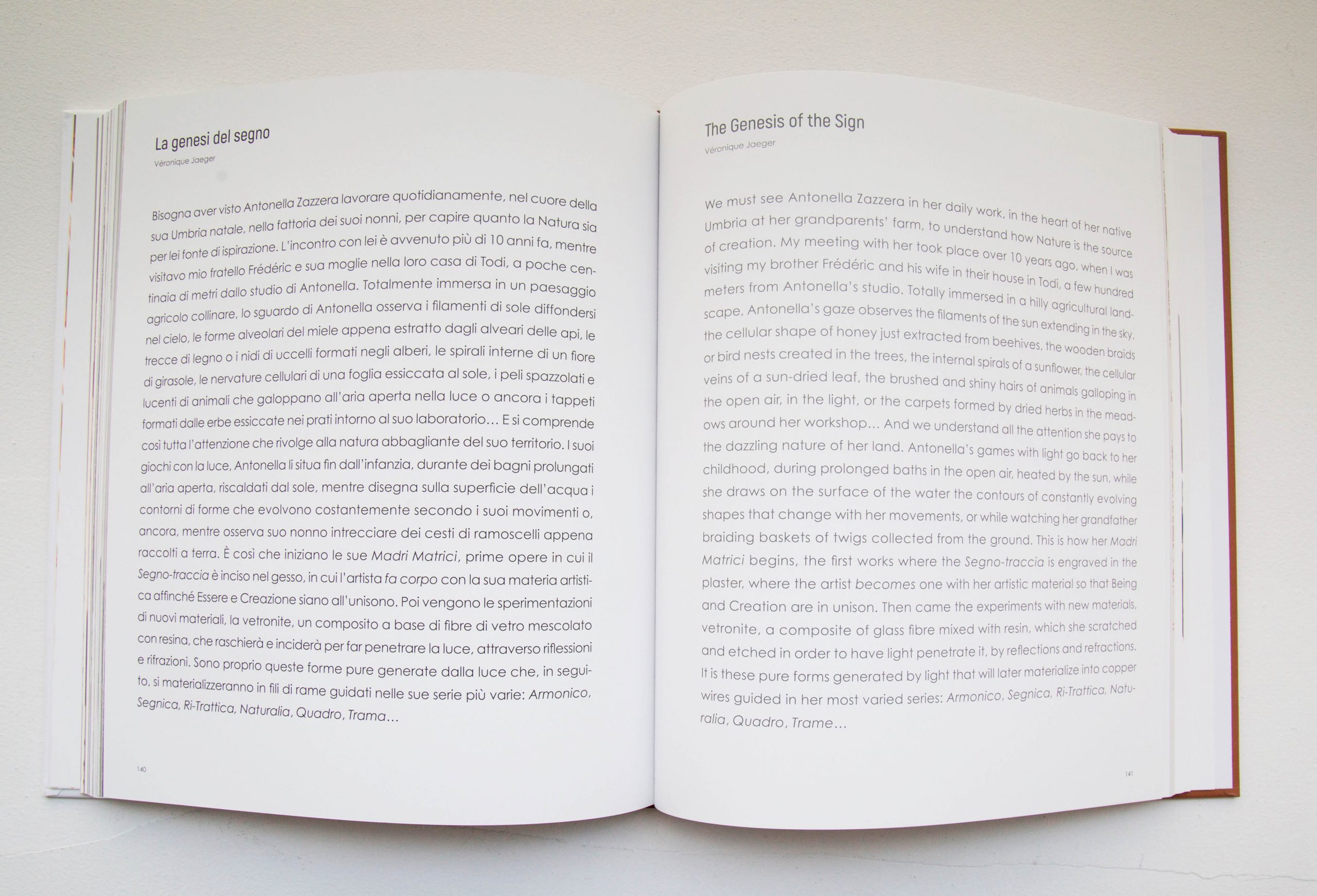 We must see Antonella Zazzera in her daily work, in the heart of her native Umbria on her grandparents’ farm, to understand how Nature became the source of her creation. (…) Antonella’s play with light goes back to her childhood, during prolonged moments in the open air, heated by the sun, while on the surface of the water, she drew the contours of constantly evolving shapes that would change with her movements or while watching her grandfather braiding baskets of twigs picked from the ground. This is how her “Madri Matrici” began, the first works in which the “Segno-traccia” was engraved in plaster, where the artist became one with her artistic material so that Being and Creation were in unison. Then came the experiments with new materials, vetronite, a composite of glass fabric mixed with resin, which she scratched and etched in order to have light penetrate it, through reflections and refractions. It is these pure forms generated by light that would later materialize into copper wires throughout in her most varied series: “Armonico,” “Segnica,” “Ri-Trattica,” “Naturalia,” “Quadro,” “Trame”…